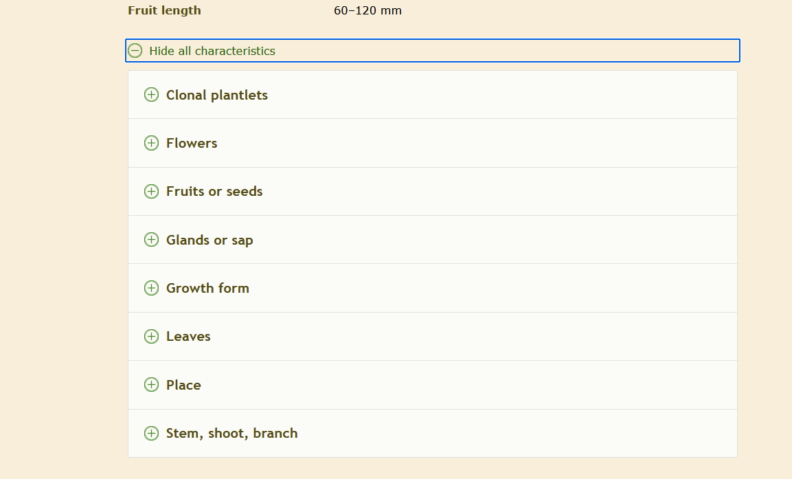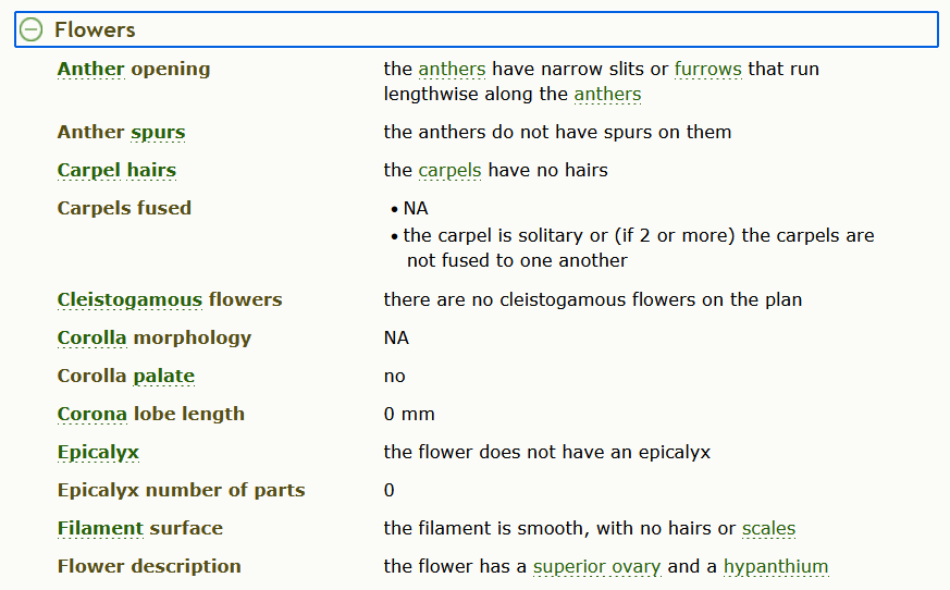A sample of one of the dropdowns for Apios americana. These descriptions are more technical, but they also have illustrative tips with descriptions and photos if you hover over the words in green with a dotted underline.