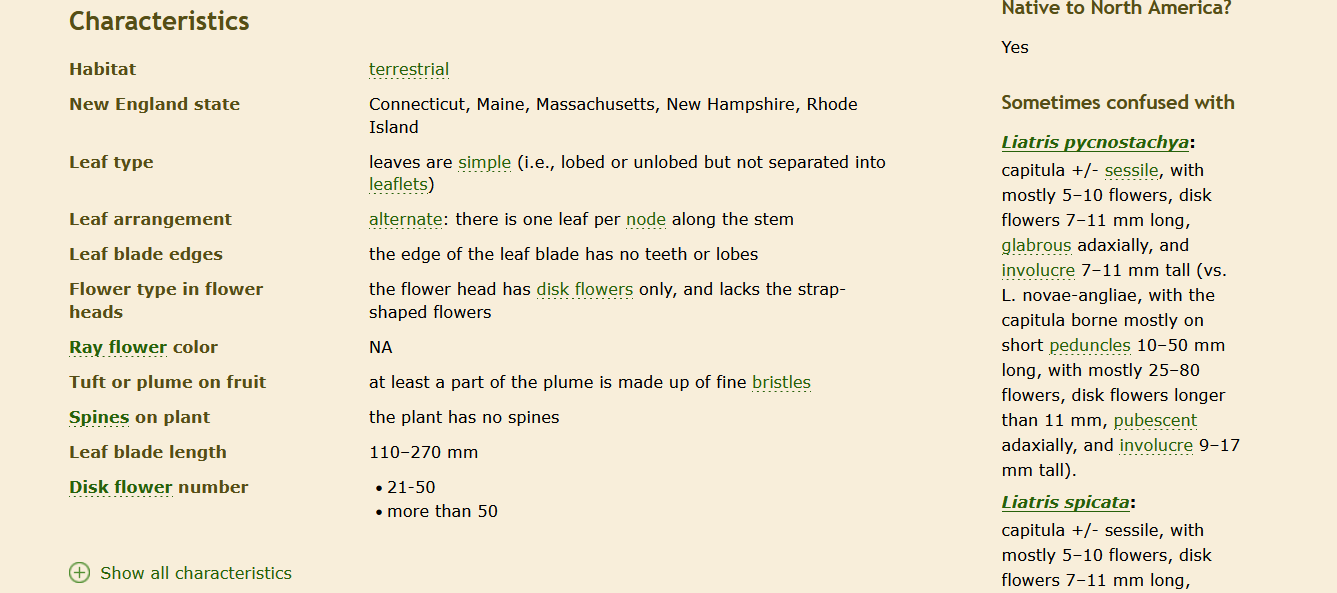 Neither Apios nor Orontium have lookalike plants, so if we break from our theme for a moment to showcase the page for Liastris novae-angeliae we can see that, underneath the map section, there is also a helpful sometimes confused with section that can help you differentiate between plants. These are linked to the lookalike plants’ pages as well if you need to make a more in-depth identification of those plants.